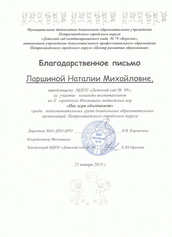 Инструктор ФИЗО Роза Викторовна Фофанова подготовила участников, которые самостоятельно привели подвижную игру с участниками фестиваля. Мероприятие проходило в Детском саду № 79.