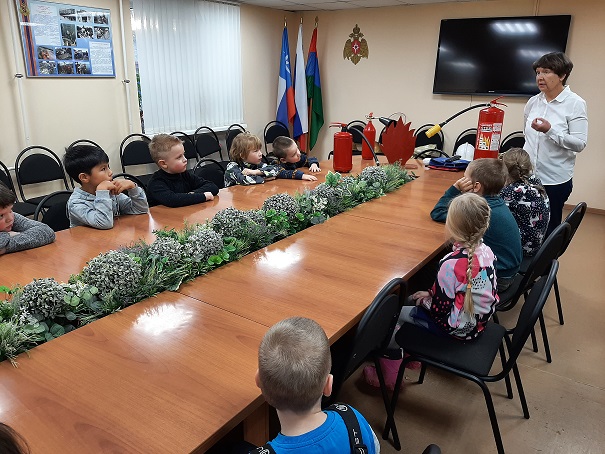 В конце экскурсии мы посмотрели мультфильм «Аркадий Паровозов спешит на помощь - Пожар в подъезде», а затем повторили правила поведения при пожаре.