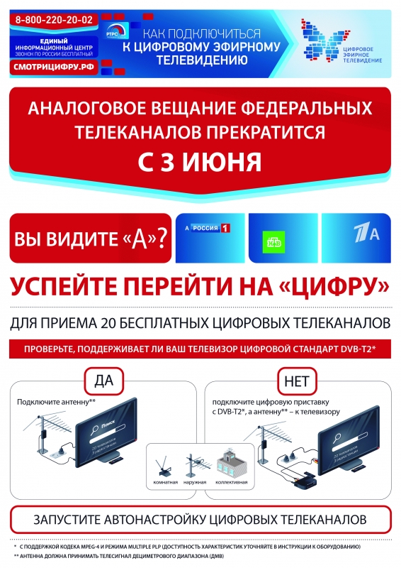 Компания выделила бесплатный многоканальный номер 8-800-200-33-60, по которому жители республики могут уточнить, находится ли их населенный пункт в зоне охвата цифровым эфирным вещанием и в каких случаях можно оформить компенсацию расходов на приобретение и установку спутникового приемного телевизионного комплекта.