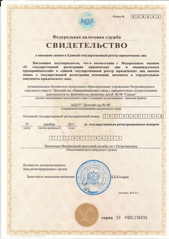 Муниципальное бюджетное дошкольное образовательное учреждение Петрозаводского городского округа «Детский сад общеразвивающего вида с приоритетным осуществлением деятельности по физическому развитию детей № 98 „Сказка“.